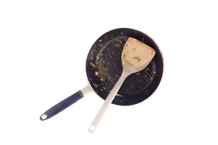 Dirty used padle and iron pan after cook on white background