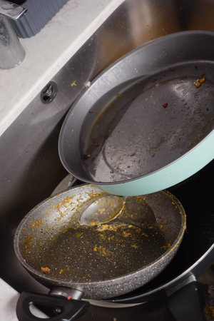 Oily dirty black frying pan left on a gas stove. Unwashed messy cookware after cooking. Unhealthy food choices and lifestyle that leads to obesity. Greasy surface from fried fatty meal in the kitchen.