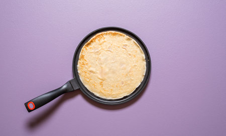 Top view with a french pancake freshly baked in a cast iron pan on a purple background. Making crepes in a pan, above view.