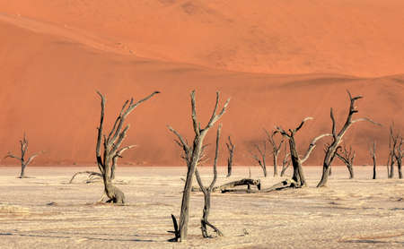 Dry terrain, dead tree and red dune - Lack of water. Namibia, Deadvlei, Sossuvlei.