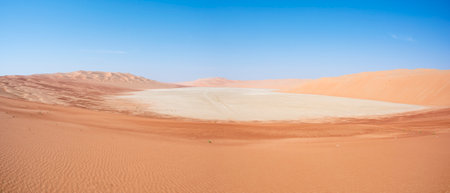 Panorama of sand dunes and continental sabkha adorned with expansive salt flats in Abu Dhabi, United Arab Emirates. This landscape showcases the natural beauty of the Middle East