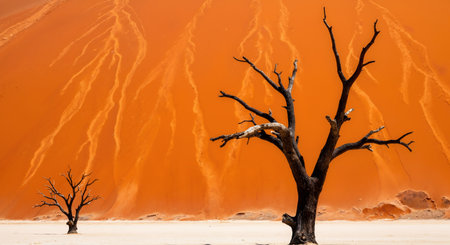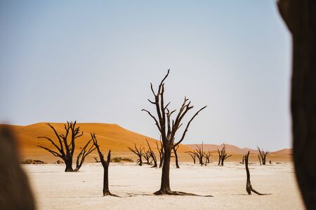 Abstract dead Camelthorn trees against orange sand dunes and blue sky in Deadvlei, Sossusvlei, Namib-Naukluft National Park. Famous travel destination in Namibia, Africa.