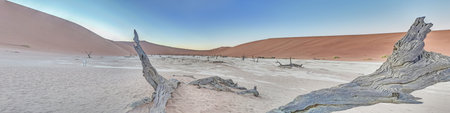 Panoramic picture of the Deadvlei salt pan in the Namib Desert with dead trees in front of red sand dunes in the morning light in summer