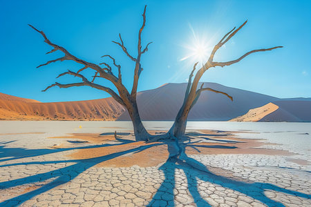 In the desert of sossusvleis, a dead tree stands tall in an oasis with long shadows on its branches and trunk, creating a striking contrast between light and shadow. the sun shines brightly above as sand dunes loom in the background, casting intricate patterns onto the ground below. this scene captu