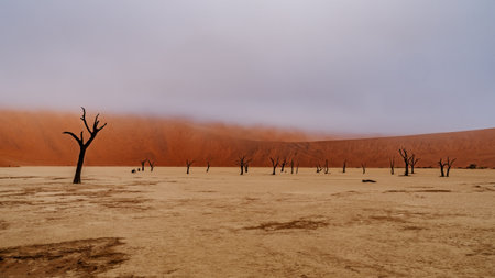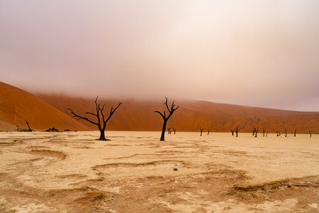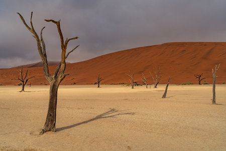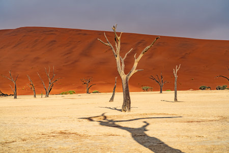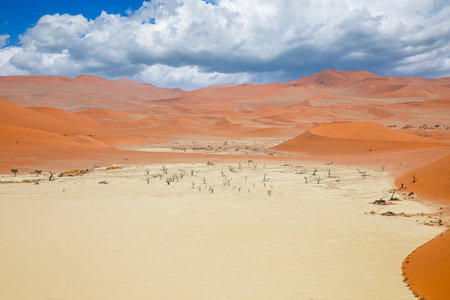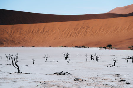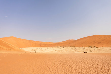 The scenic Sossusvlei and Deadvlei, clay and salt pan with braided Acacia trees surrounded by majestic sand dunes. Namib Naukluft National Park, travel destination in Namibia.