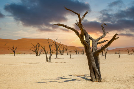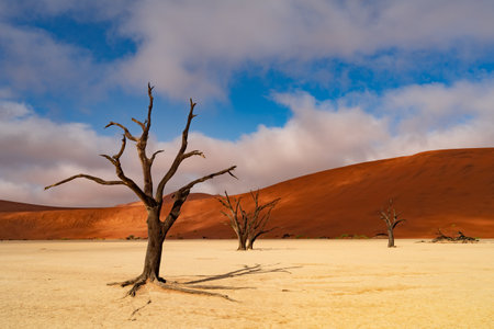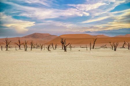 Dead trees with a beautiful cloudy sky at sunrise in Dead Vlei in Sossusvlei, part of the Namib-Naukluft National Park - Namibia