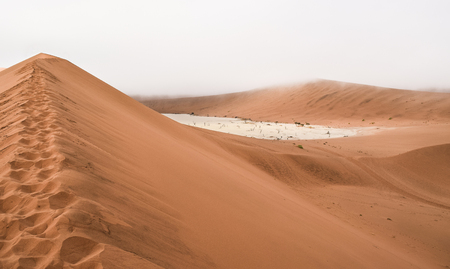 Yellow-red dunes and ringing silence. Sunny morning. The bottom of the dried lake Sussussflay. Grand trip to Namib Naukluft desert. The concept of active, exotic, extreme and photo tourism
