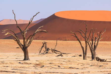 Dead camelthorn trees and red dunes in Deadvlei, Sossusvlei, Namib-Naukluft National Park, Namibia, background blue sky