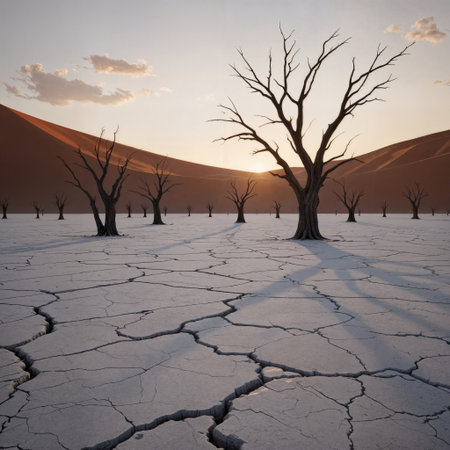 A desolate landscape of dead trees in a dry, cracked lake bed with mountains in the background