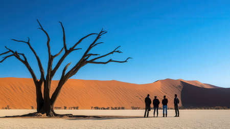 The red desert, dead trees, and tourists hiking in the sand dunes. Sossusvlei is a salt and clay pan surrounded by high red dunes, Namib-Naukluft National Park, Namibia.