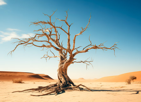 A dead tree sitting in the middle of a desert. Generative AI image.
