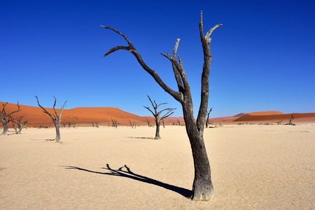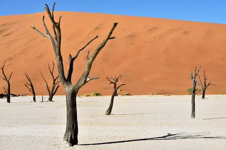 Dead Camelthorn Trees against red dunes and blue sky in Deadvlei, Sossusvlei. Namib-Naukluft National Park, Namibia, Africa