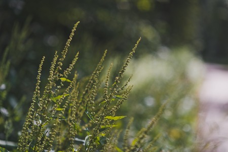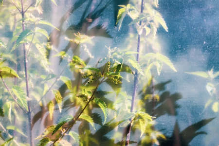 Blurred nature background with wild nettle stems. Weeds growing in the greenhouse.