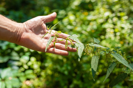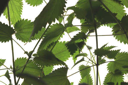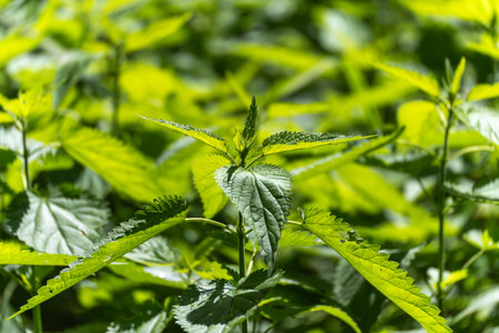 Bright green leaves of young nettles on lawn on sunny day. Top view.. Summer Harvest Delight concept