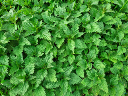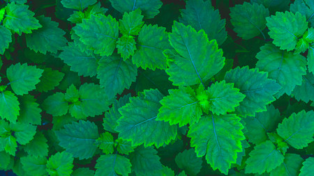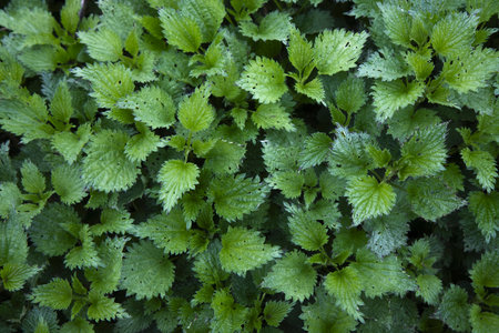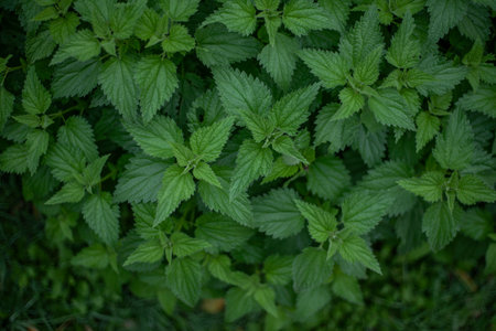 Stinging nettle plants background, Urtica dioica leaves, overhead view