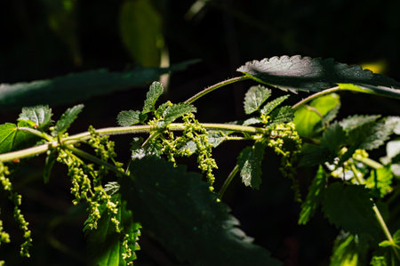 Stinging nettle (Urtica dioica)in forest with natural golden sunlight on background. Moody and dark photo of plants in forest.
