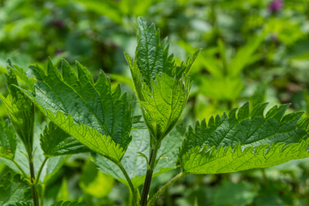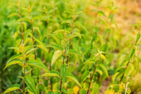 Fresh stinging nettle leaves. Common nettle (Urtica dioica) Nettle plant in field. Green natural background with soft selected focus. Alternative medicine.