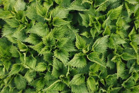 Fresh nettle leaves background. Top view of the thicket of nettles. Green leaves background. nature background