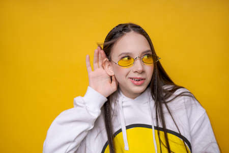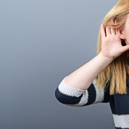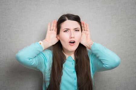Girl listens attentively with her palm to her ear close-up on gray background.