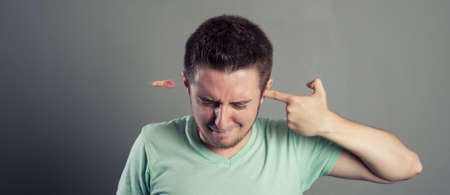 Handsome middle-aged man with salt pepper hair dressed with sports shirt is plugging his ears with fingers to not hear noise or words: he seems very disturbed