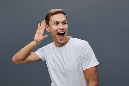 Smiling young man wearing casual white t-shirt reacting playfully holding hand near ear on gray background studio portrait