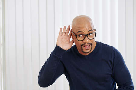 Close-up of a man eavesdropping on what others are saying. Stylish dark-skinned man in modern everyday clothes is very surprised, covers his ear with his hand, listening to rumors or gossip.