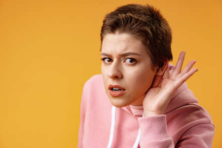 Portrait of funny plus size young woman looking aside holding hand to her ear and trying to hear something standing on white background. Cute Caucasian female with a hearing disorder or hearing loss