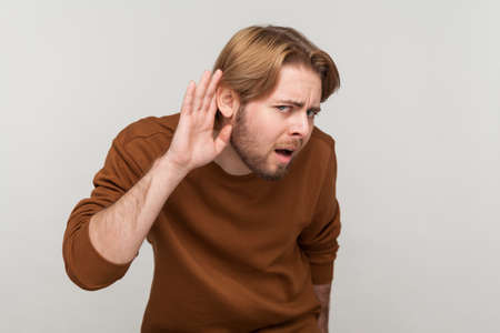 Portrait of man with beard wearing sweatshirt, standing with hand on ear and want to hear something, listening to interesting talks and private secrets. Indoor studio shot isolated on gray background.