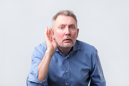 Senior man in blue shirt suffering from deafness. He wants to hear fresh rumors.