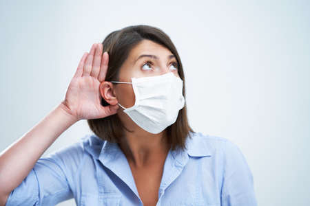 Closeup woman, girl with hand to ear listening secret gossip or quiet sound. Isolated on a white background