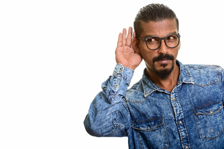man hearing loss or hard of hearing and cupping his hand behind his ear isolate grey background, Deaf concept.