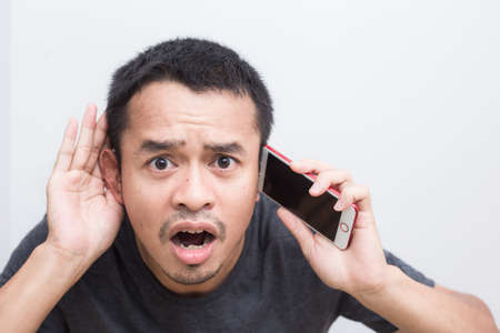 Young Asian deaf disabled man having hearing problems holds his hand over the ear, listens carefully, hard of hearing.