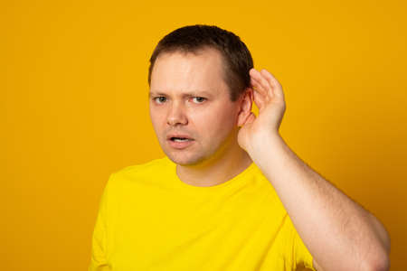 Caucasian man hold hand near ear. Trying to hear a gossip