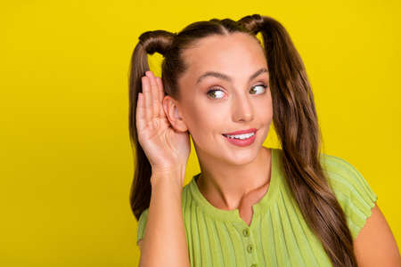 Portrait of attractive cheerful funny girl overhearing copy space advert isolated over vibrant yellow color background