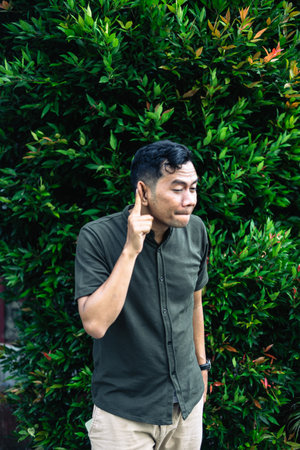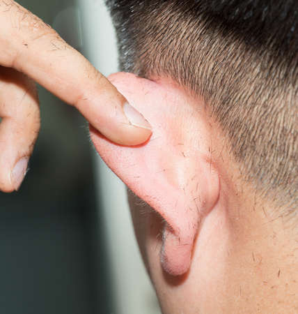 Young man with hearing problems, hearing loss or hard of hearing