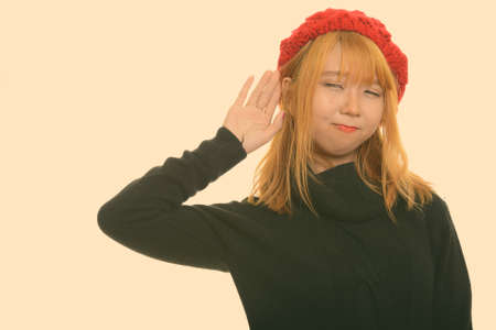 Portrait of young Asian woman with blond hair listening