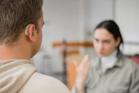 The girl and the guy talk in sign language. Two deaf students chatting in a university class.