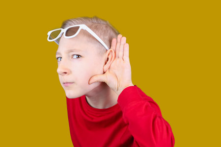 a child in 3D glasses puts his hand to his ear and tries to hear something