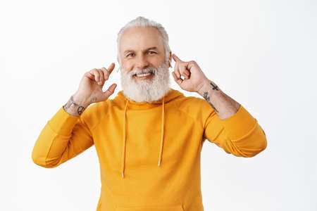 Senior hipster guy with tattoos listen music in wireless earphones, touching his headphones in ears and smiling pleased, enjoy awesome sound of earbuds, white background