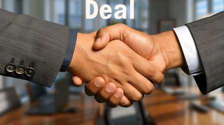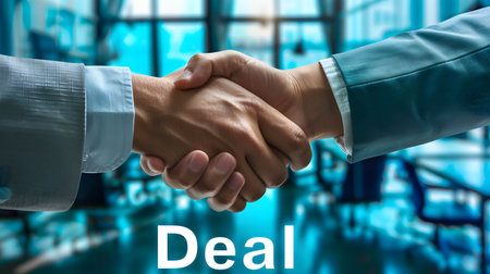 A handshake between two individuals, with word “Deal†in office background, agreement and cooperation in business or investment