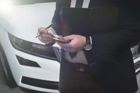 salesman selling auto in car shop or businessman buying new car holding dollar in hand.