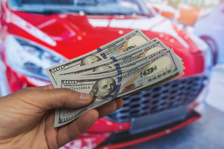 Buyer with us dollar money in the hand stands front car at showroom. Concept of car sale, purchase and leasing.