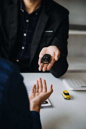 The car salesman handed the keys to the customer who passed the car purchase loan conditions ,Car rental agreement Concept.