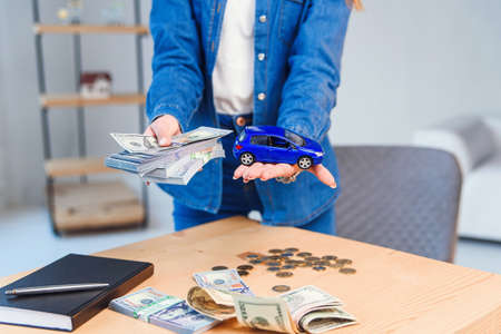 Hands with dollar bundle over car hood. Car sale or car rental concept