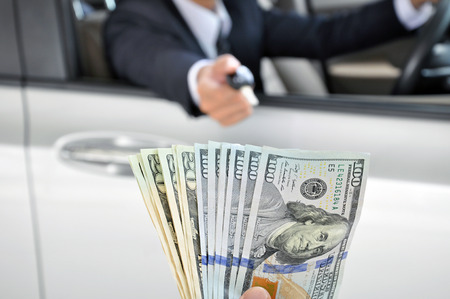 Businessman giving a car key exchanging with money - car ( auto) pawn concept