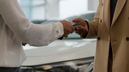 Close up hands unrecognizable seller and buyer african american woman dealer give automobile keys to man customer buying renting new car at store sale auto in dealership selling vehicle loan credit