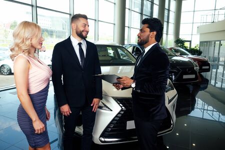 handsome indian salesman showing luxury auto for rich family buyers at modern showroom.husband and wife choosing car