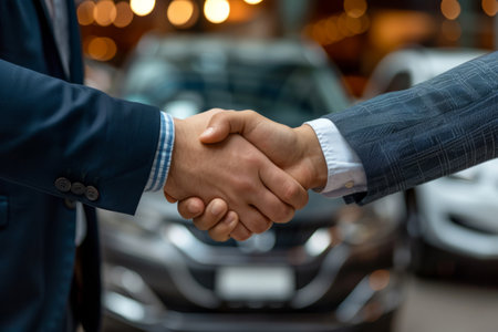 Handshake of buyer and seller near car, sale or rental