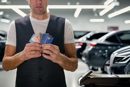 Young man buying near car and paying with credit card via wireless bank payment terminal. Convenient transactions: Payment cards offer flexibility at the banks car salon