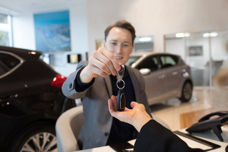 client pay for new car. salesman dealer giving key to owner. car sale & dealership in auto business